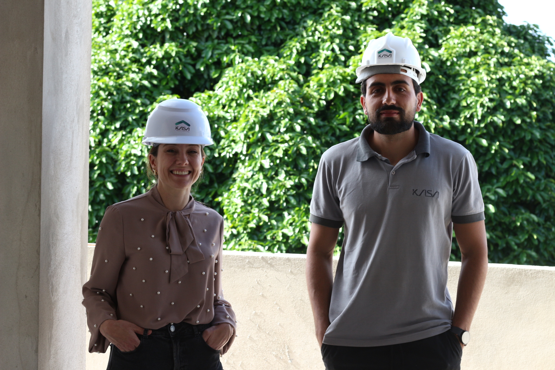 Gabriela Venturelli Bergamin, da KASA Arquitetura, ressalta proposta de acolhimento e bem-estar nos novos apartamentos. Ao seu lado, o engenheiro Vinícius Sousa.