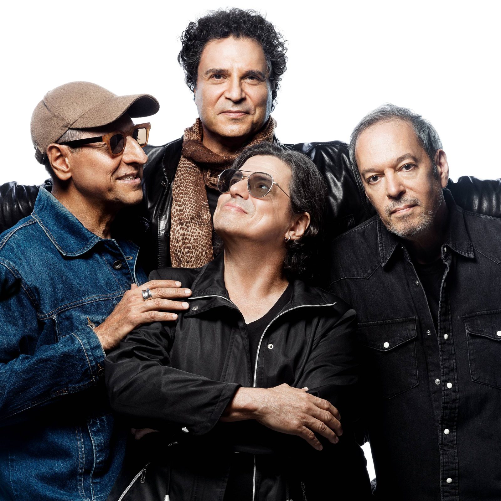 Quatro homens adultos posam juntos contra fundo branco. Dois usam óculos escuros, um veste boné bege e jaqueta jeans, outro usa jaqueta preta com capuz. Homem ao centro atrás usa cachecol marrom e jaqueta preta, olhando para frente. Homem à direita veste jaqueta preta e olha diretamente para a câmera.