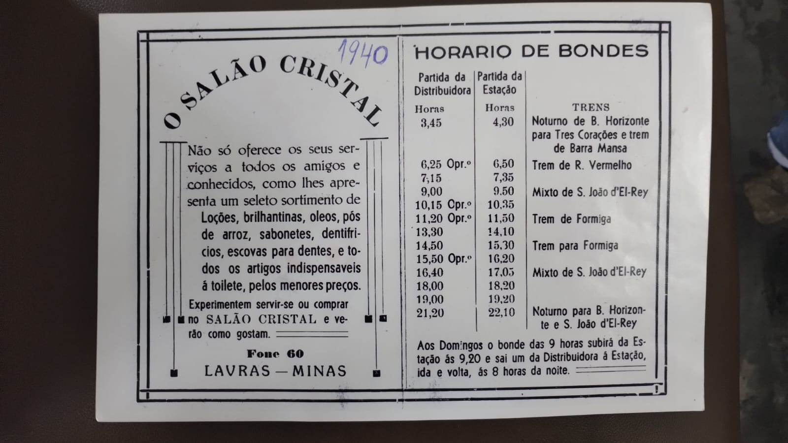 Hoje proprietário da marca, Luiz Almeida guarda com orgulho um pequeno cartaz de propaganda do salão datado dos anos 1940, onde se lê os horários de funcionamento dos bondes e dos trens. Uma relíquia que testemunha uma Lavras bucólica, quase paradisíaca.