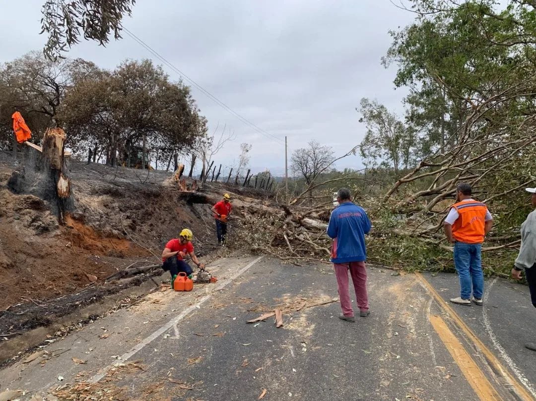 Durante a vistoria, verificou-se que as árvores, três eucaliptos de grande porte, estavam com as bases dos seus troncos comprometidas, danos causados pelas recentes queimadas que aconteceram no local. Como medida preventiva para evitar acidentes caso ocorresse a queda da mesma na via, foi necessário realizar o corte total das árvores.