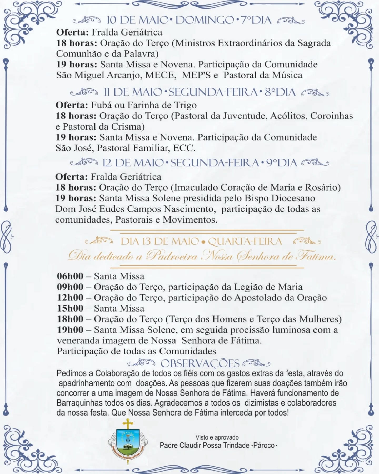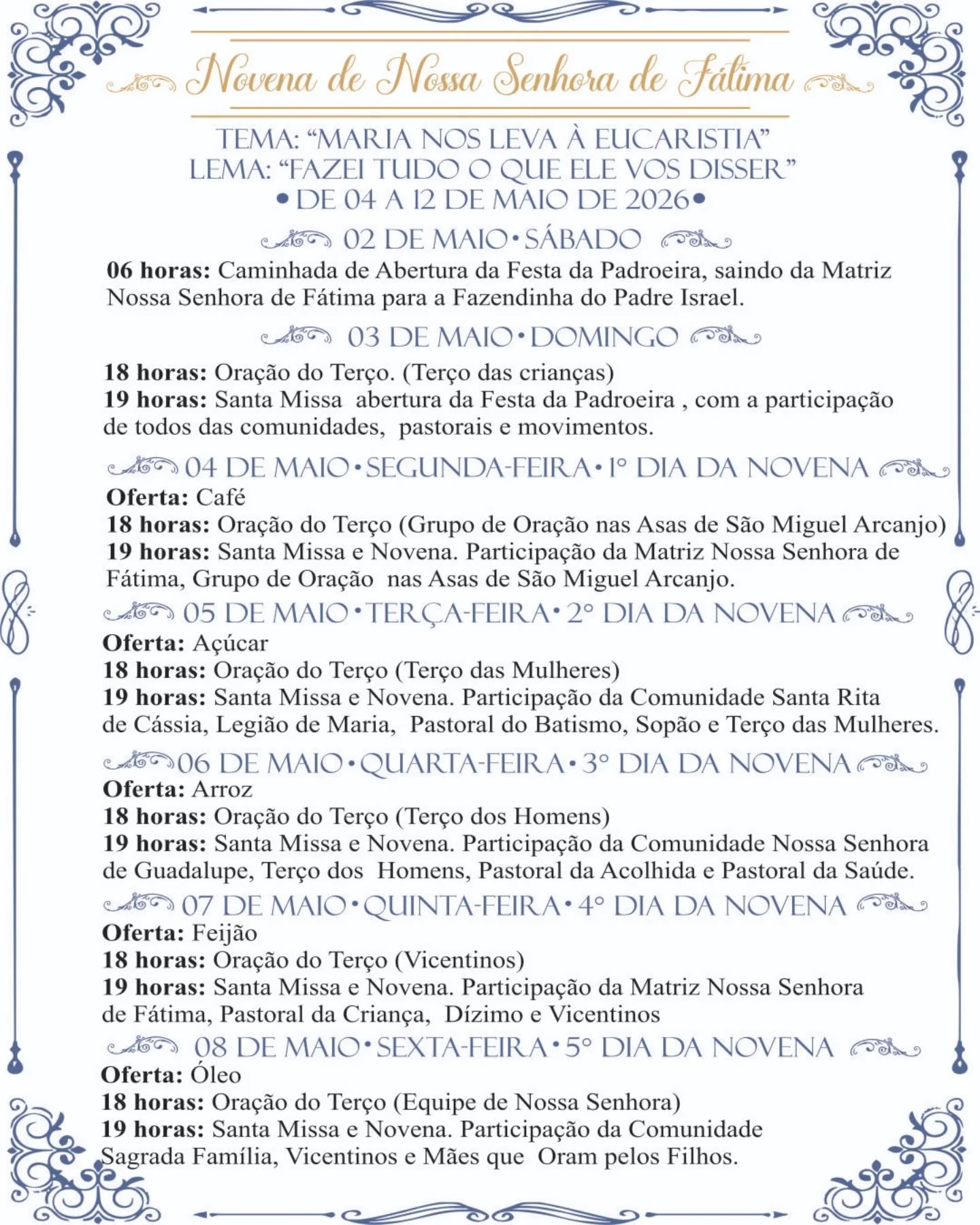 A Paróquia Nossa Senhora de Fátima realiza, entre os dias 2 e 13 de maio, a tradicional festa em honra à sua padroeira, reunindo fiéis em momentos de fé, oração e celebração.