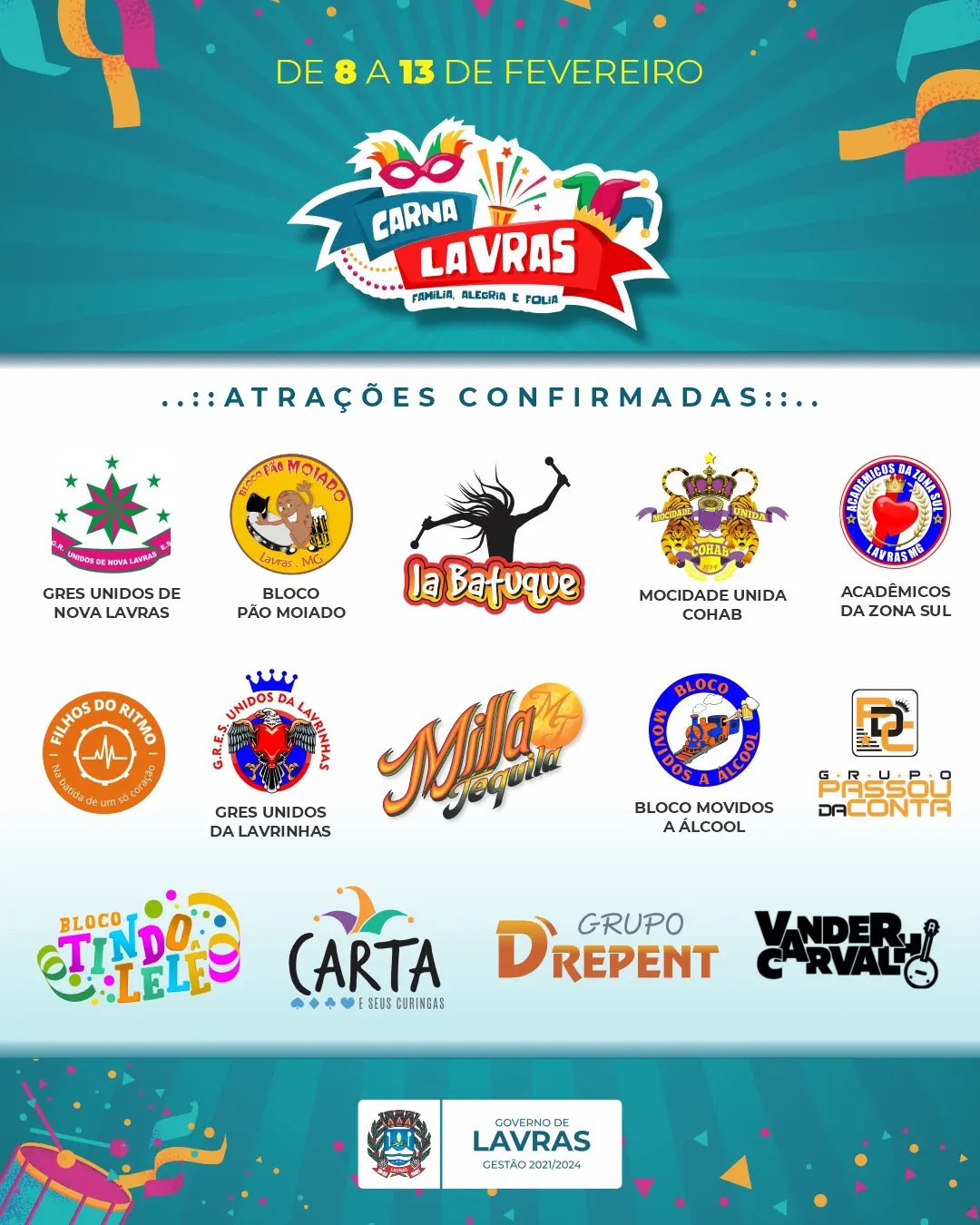 A Prefeitura Municipal de Lavras, através da Secretaria Municipal de Cultura, Esporte, Lazer e Turismo (SCELT), divulgou nesta sexta-feira (19) as atrações do Carnalavras 2024. O evento acontecerá de 8 a 13 de fevereiro.