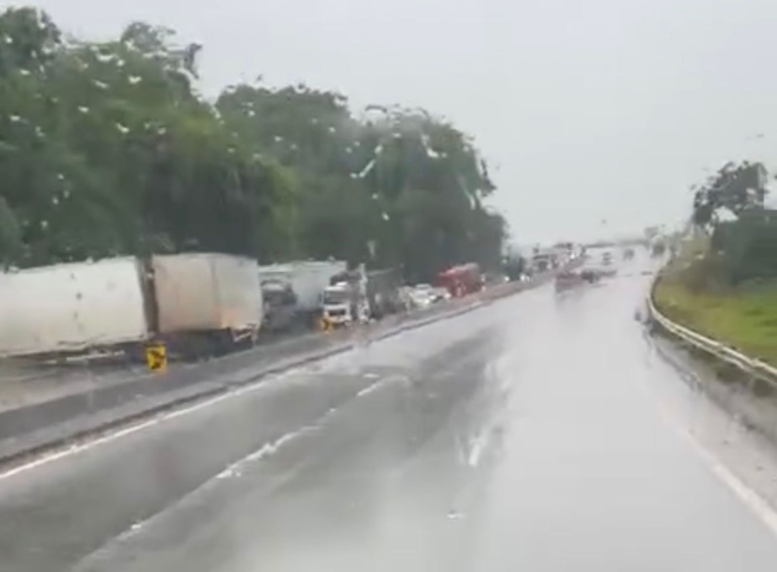 Uma carreta baú perdeu o controle na pista molhada e fez um movimento em “L” no km 704,5 da BR-381/SP, sentido Belo Horizonte, na manhã chuvosa deste domingo (23). A faixa esquerda está interditada e equipes da concessionária trabalham no atendimento e na liberação total da via.