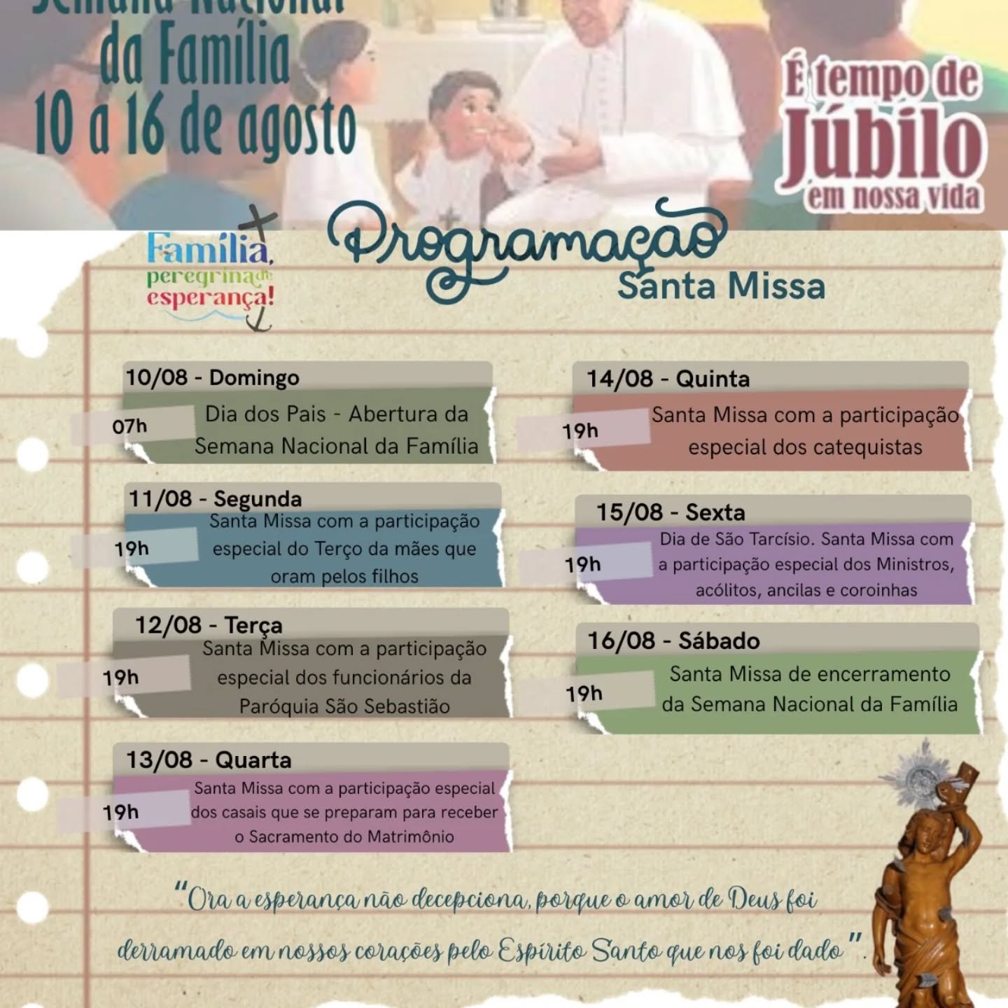 A Paróquia São Sebastião realizará, entre os dias 10 e 16 de agosto, a Semana Nacional da Família. Com o tema “É tempo de Júbilo em nossa vida” , a programação contará com celebrações, momentos de oração e atividades especiais voltadas para o fortalecimento dos laços familiares e da fé cristã.