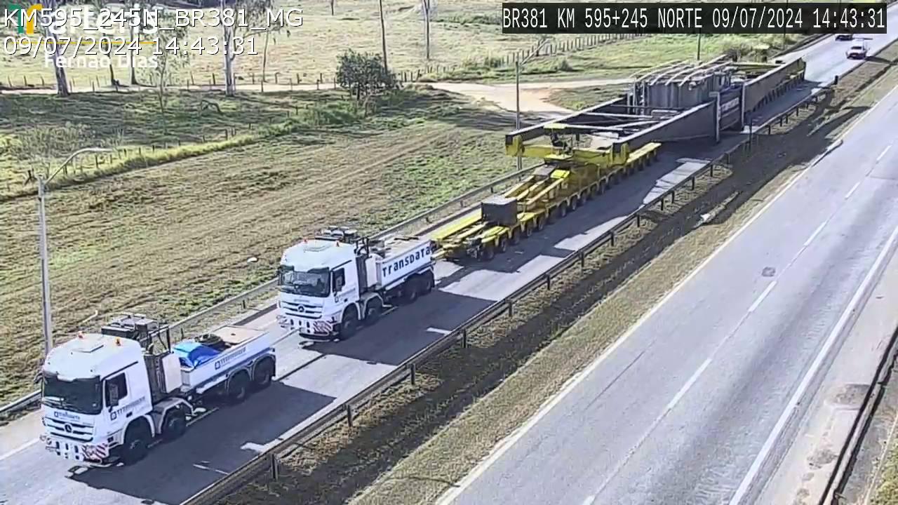 O veículo está acompanhado por escolta do transportador, viatura da concessionária e pela Polícia Rodoviária Federal, e trafega em velocidade reduzida, podendo causar lentidão. Ao avistar sinalização, reduza a velocidade.