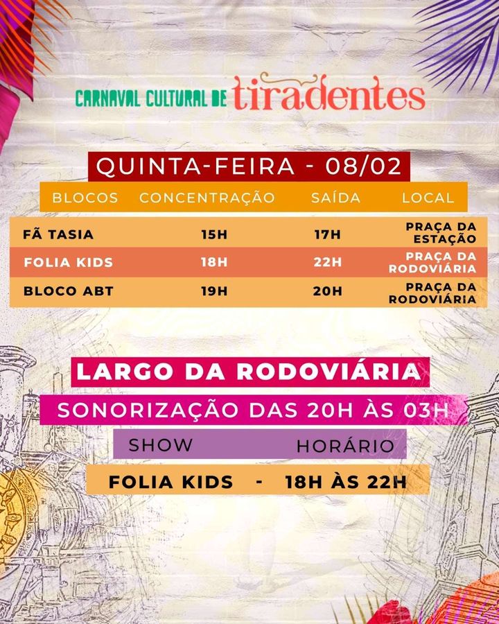 Para quem deseja curtir o Carnaval em um dos cenários históricos de Minas Gerais, Tiradentes já tornou disponível a programação para a folia na cidade, que começa nesta quinta-feira (8). Com possibilidades de blocos, shows e eventos para crianças, a programação o Carnaval de Tiradentes é gratuita e voltada a todos os públicos.