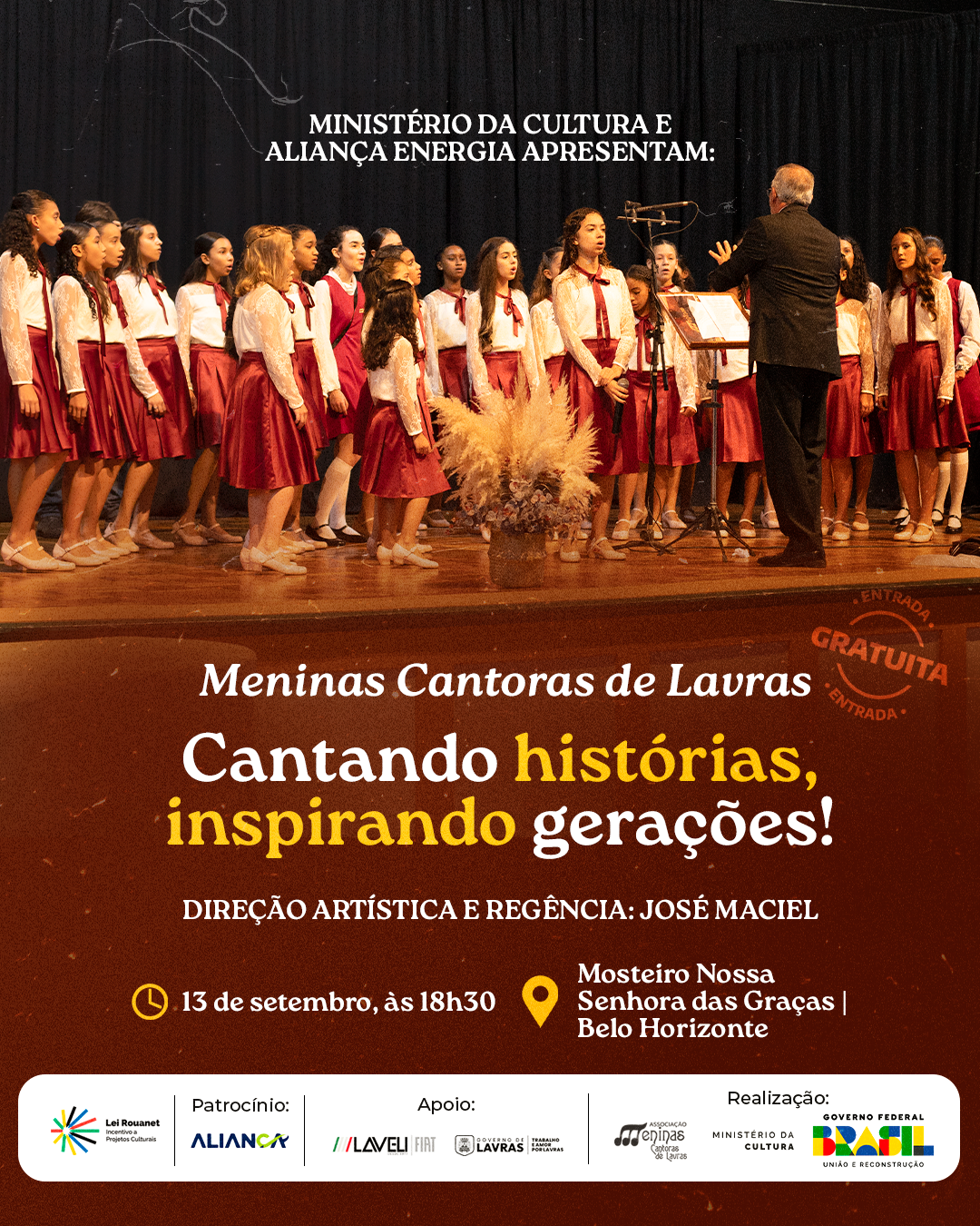 No dia 13 de setembro, às 18h30, o público de Belo Horizonte terá a oportunidade de assistir a uma apresentação especial das Meninas Cantoras de Lavras, no Mosteiro Nossa Senhora das Graças. O concerto, com entrada gratuita, é uma realização do Ministério da Cultura e da Associação das Meninas Cantoras de Lavras, com patrocínio da Aliança Energia por meio da lei federal de incentivo à cultura. A direção artística e regência ficam a cargo de José Maciel.