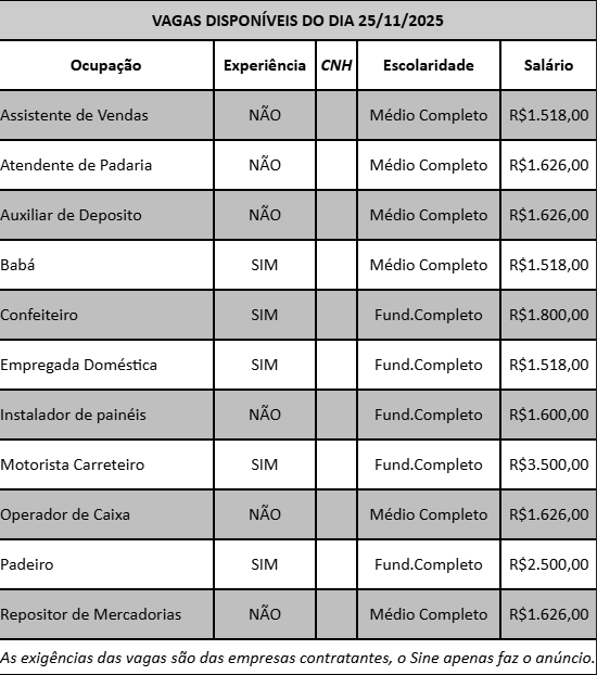 Os interessados devem comparecer à sede da UAI, localizada na Praça Monsenhor Domingos Pinheiro, 79, e procurar o supervisor do SINE para mais informações e encaminhamentos.