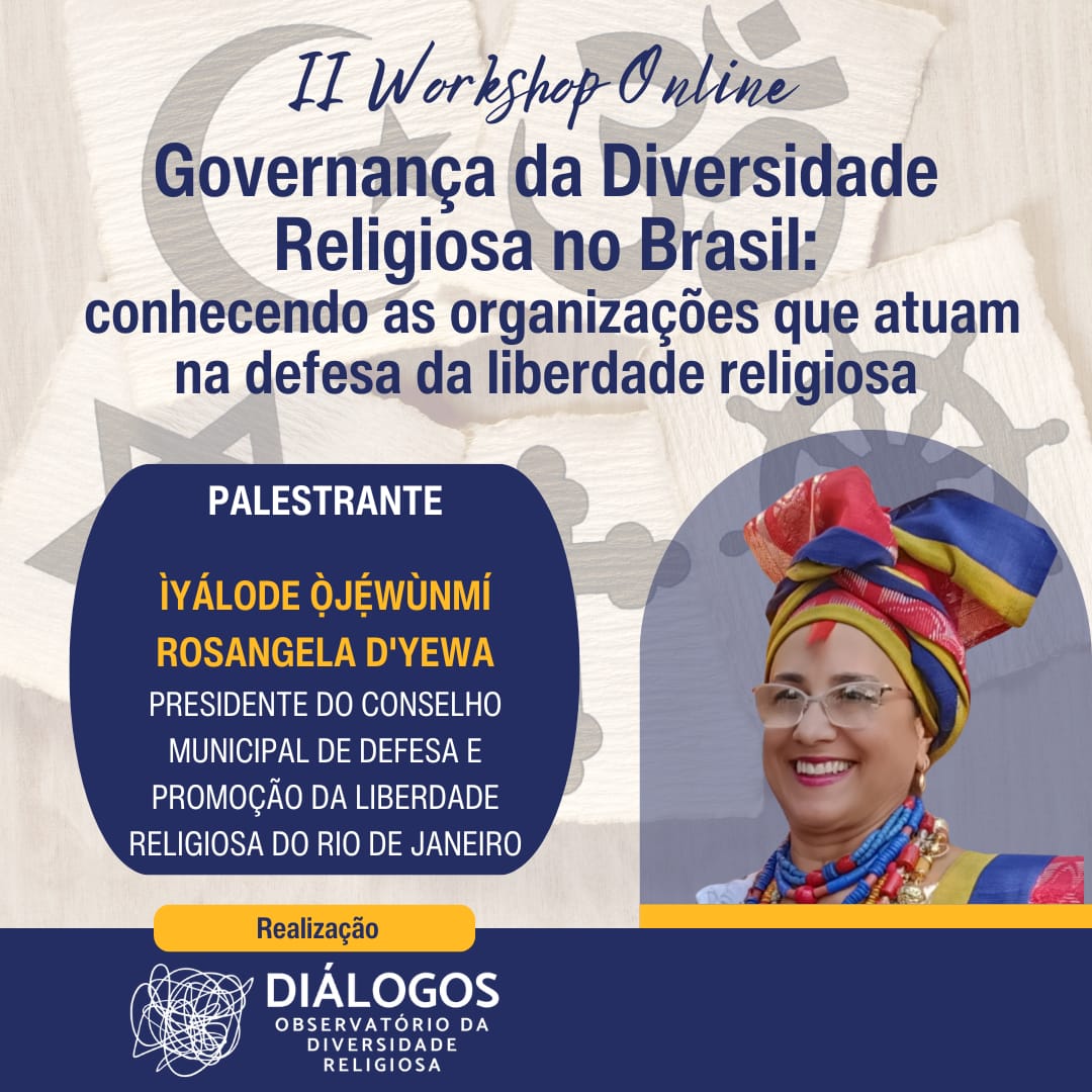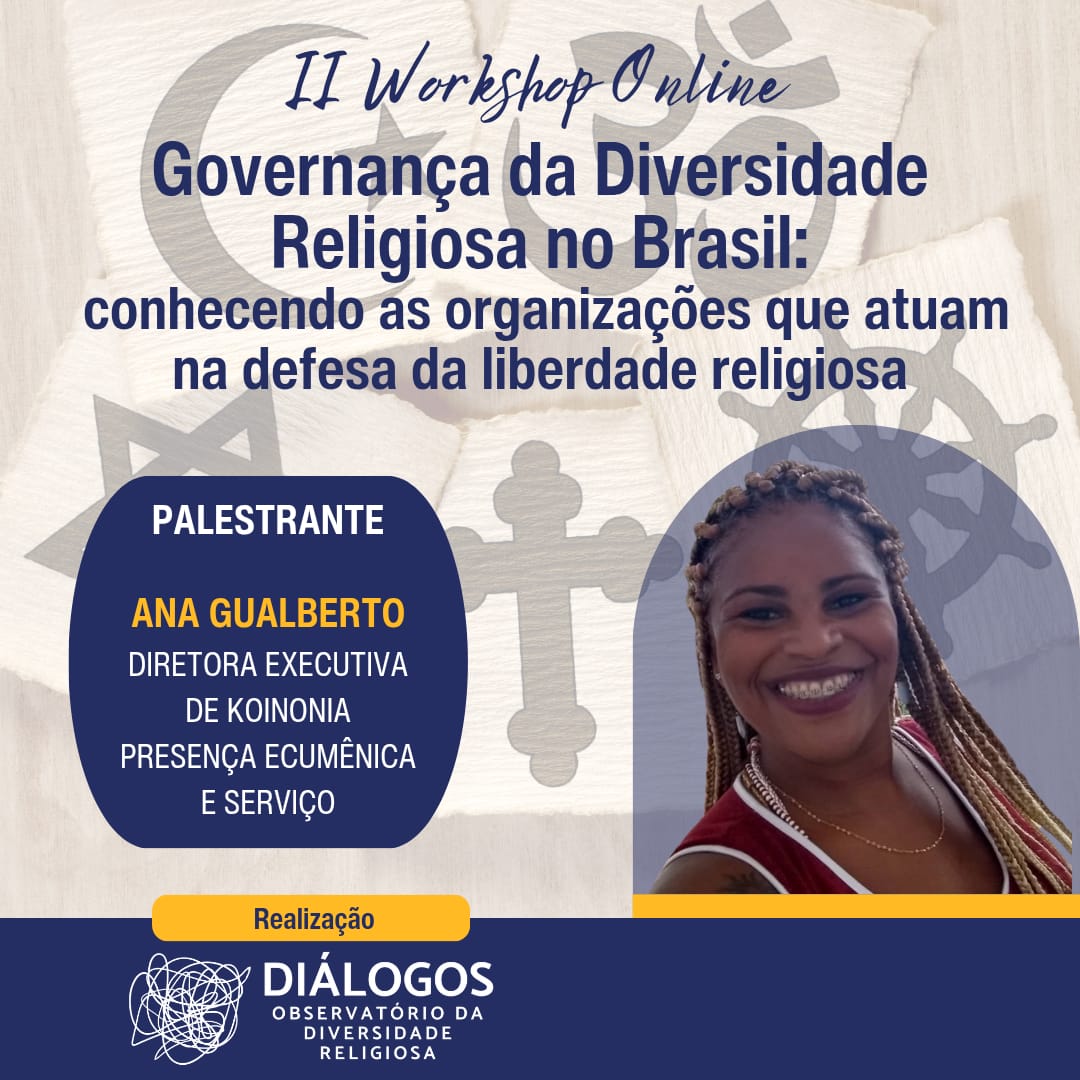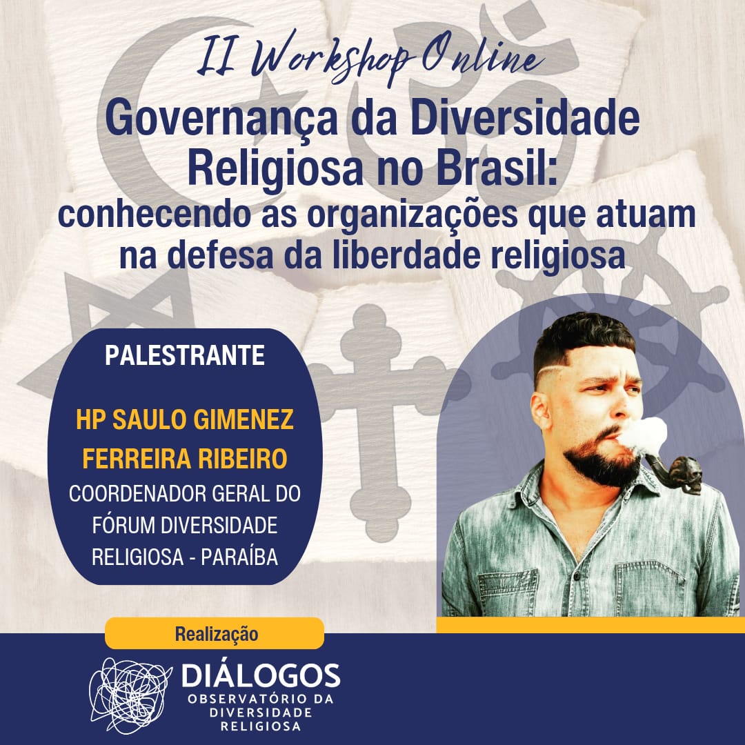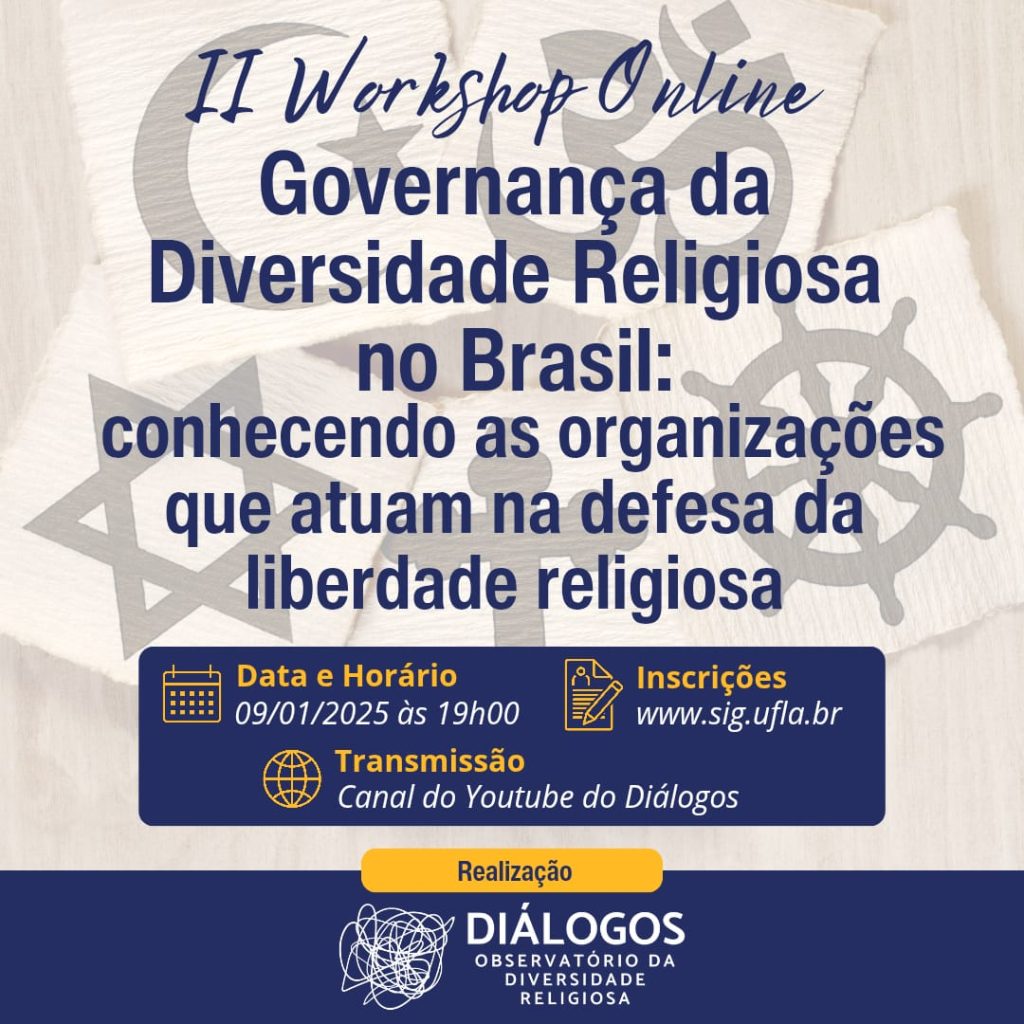 No dia 09 de janeiro, às 19h00, será realizado a 2ª Edição do Workshop Online “Governança da Diversidade Religiosa no Brasil: conhecendo as organizações que atuam na defesa da liberdade religiosa”, com transmissão ao vivo pelo Canal do YouTube do “Diálogos – Observatório da Diversidade Religiosa”.