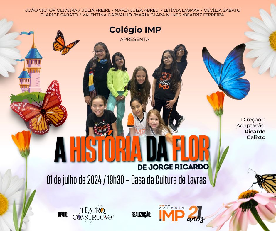 No dia 1 de julho, às 19h30, os alunos do Colégio IMP irão encenar o espetáculo infantil “A História da Flor” na Casa da Cultura de Lavras. Com autoria de Jorge Ricardo e direção e adaptação de Ricardo Calixto, a peça promete encantar crianças e adultos com uma emocionante história sobre a beleza e o amor. De forma divertida e cômica as personagens estarão envolvidas na solução de um grande desafio.