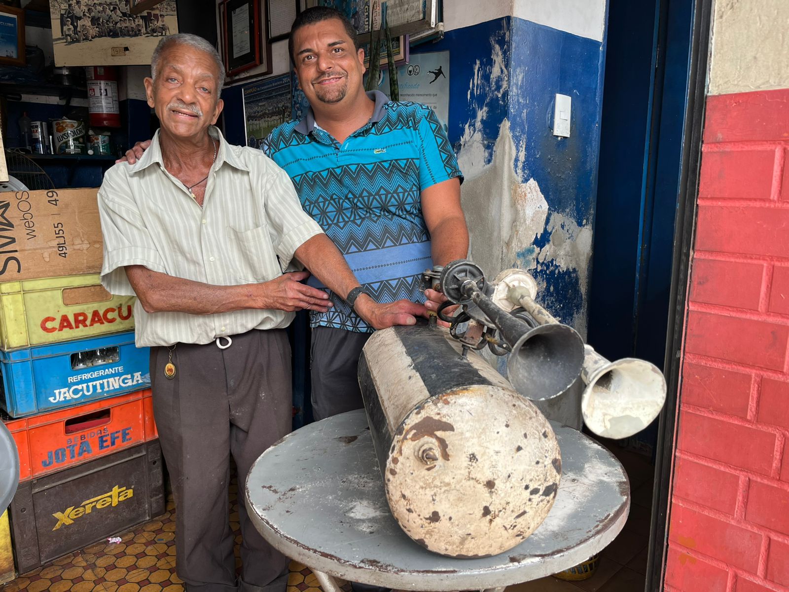 Avô e neto diante de uma tradição: a charanga que levou alegria e música para a torcida do Fabril.