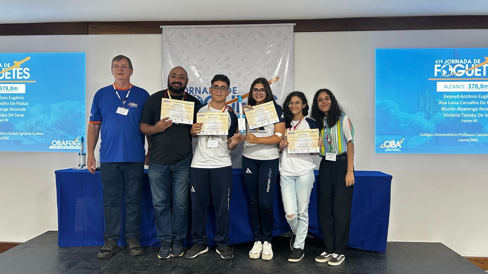 A equipe do Colégio Unilavras, formada pelos alunos Ana Luiza Carvalho de Pádua, Victória Tanaka de Sena e Murilo Alvarenga Rezende, sob a orientação do professor Deyvid Eugênio, conquistou um feito impressionante: a 2ª colocação no ranking de melhor alcance, com um foguete que atingiu incríveis 378,8 metros.