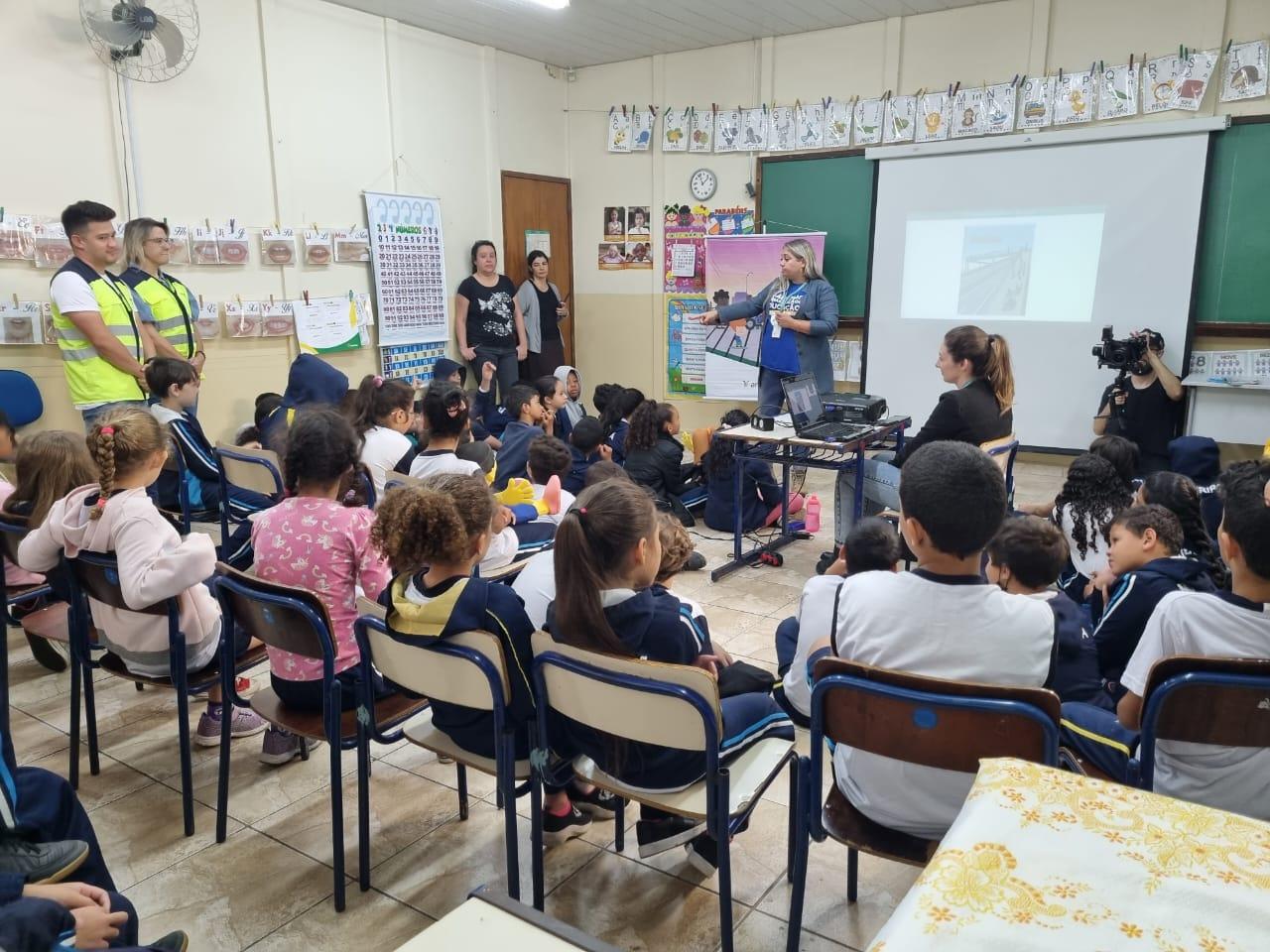 No Projeto Escola, participaram 78 escolas, com 459 desenhos inscritos. O objetivo é estimular a criatividade e visão dos estudantes sobre o tema “Pedras no Caminho”, com base na situação proposta: “A Turminha Pé na Estrada se depara com uma estátua que reproduz a Grande Esfinge de Gizé, portando equipamentos de segurança no trânsito, ao lado de pedras de papel contendo mensagens de alerta e um dispositivo de inteligência artificial programado para conversar com os transeuntes. Colocada às margens da rodovia, a esfinge ajuda as pessoas a transitarem com consciência e responsabilidade”.
