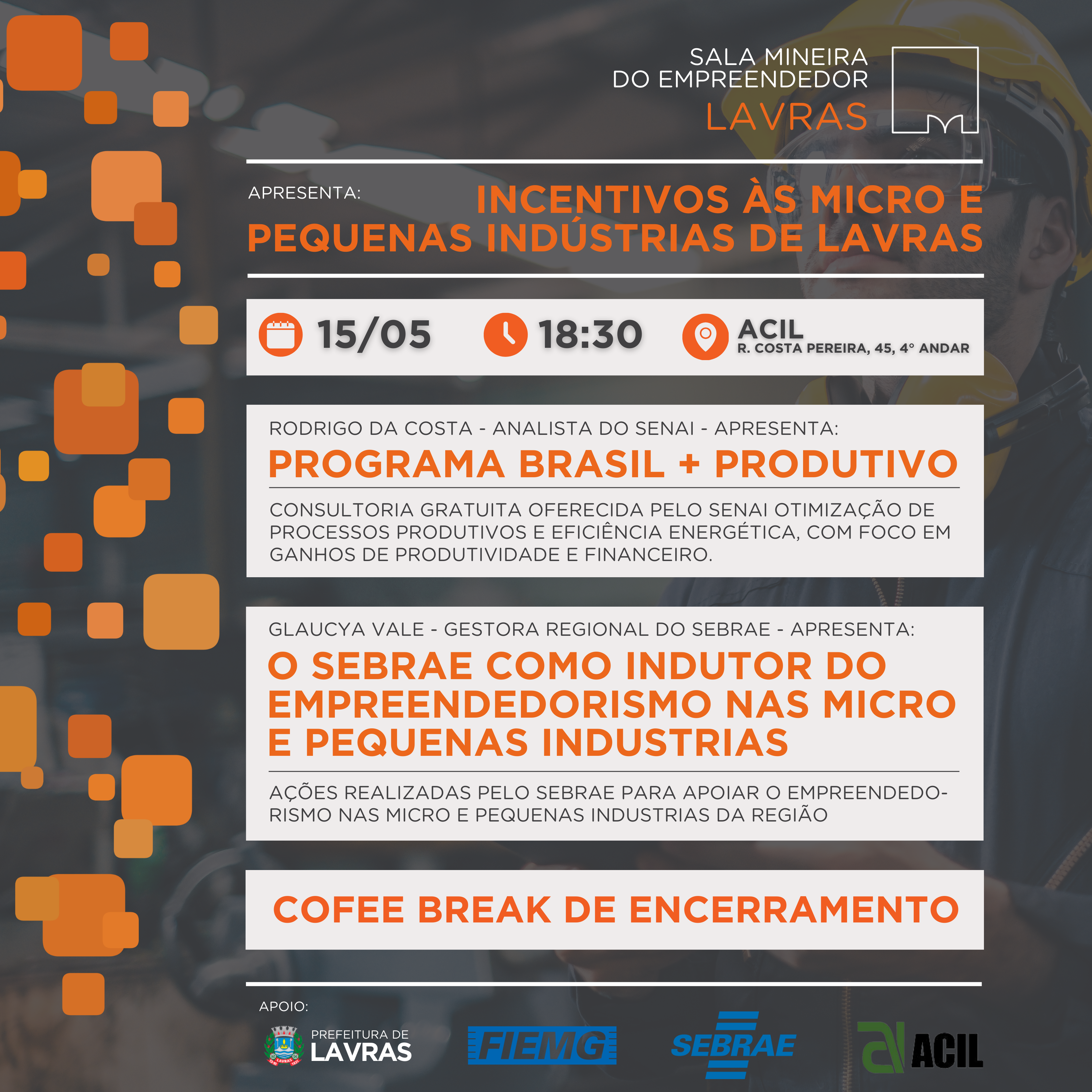 A Sala Mineira do Empreendedor Lavras promoverá um evento para apresentar novos incentivos oferecidos pelo SENAI e SEBRAE para os representantes das Micro e Pequenas industrias de Lavras.