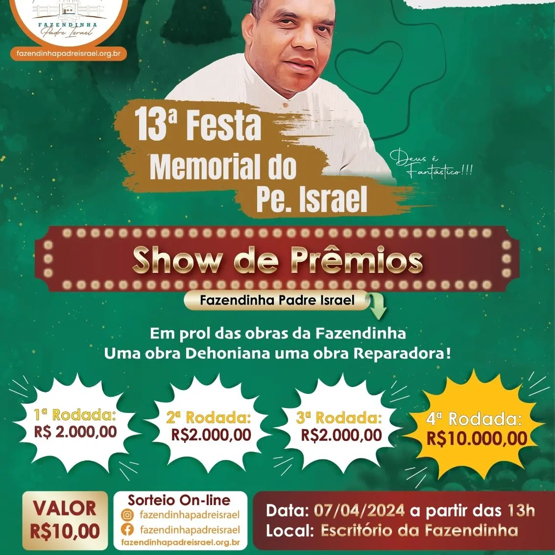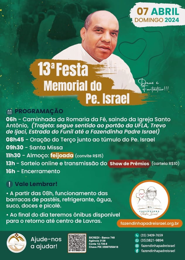 Abril será o mês da realização da décima terceira edição da Festa Memorial do Pe. Israel. Haverá caminhada, missa, venda de pastéis e refrigerantes, sorteio de prêmios e almoço (veja programação abaixo).