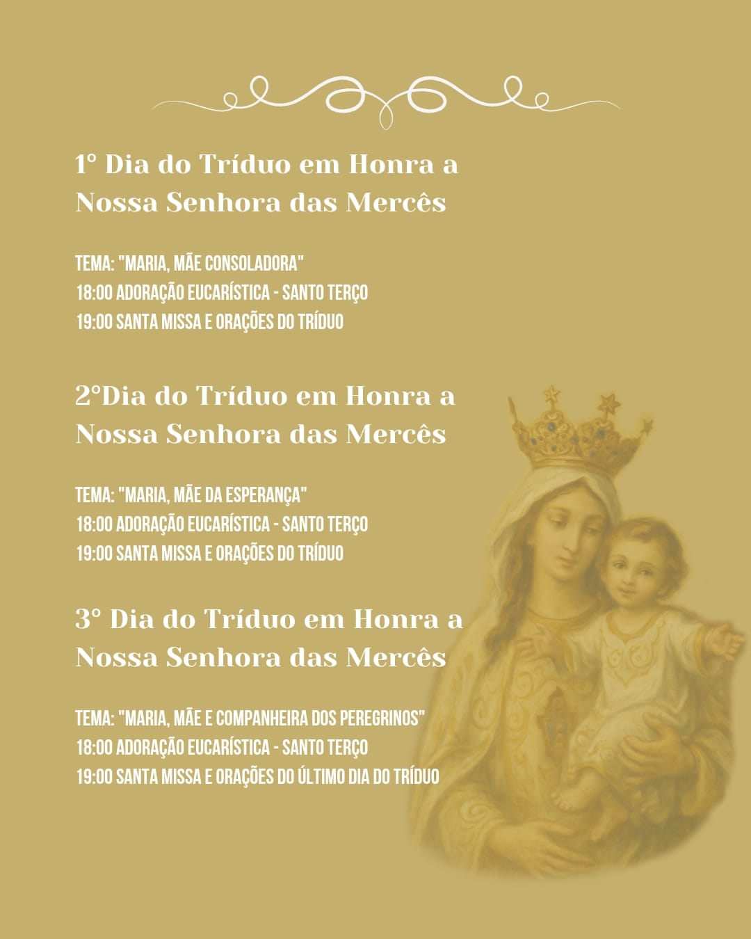 As atividades começam com o tríduo preparatório, realizado em três noites consecutivas, sempre às 18h, com Adoração Eucarística e Santo Terço. Em seguida, às 19h, acontece a Santa Missa, cada dia dedicada a uma reflexão: Maria como mãe consoladora, mãe da esperança e companheira dos peregrinos.
