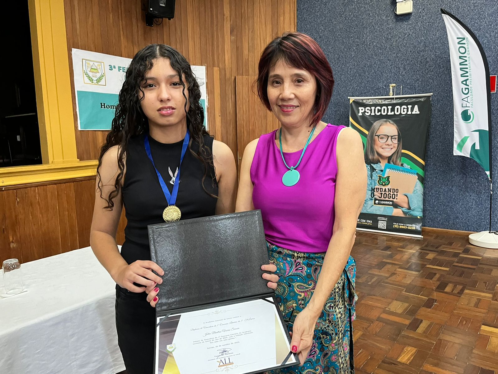 O presidente e a vice-presidente da ALL, os professores Vanderlei Barbosa e Dalva Loba (Ufla), fizeram a entrega do prêmio de R$ 300,00 a ganhadora do concurso “Era uma Vez uma Garota”.