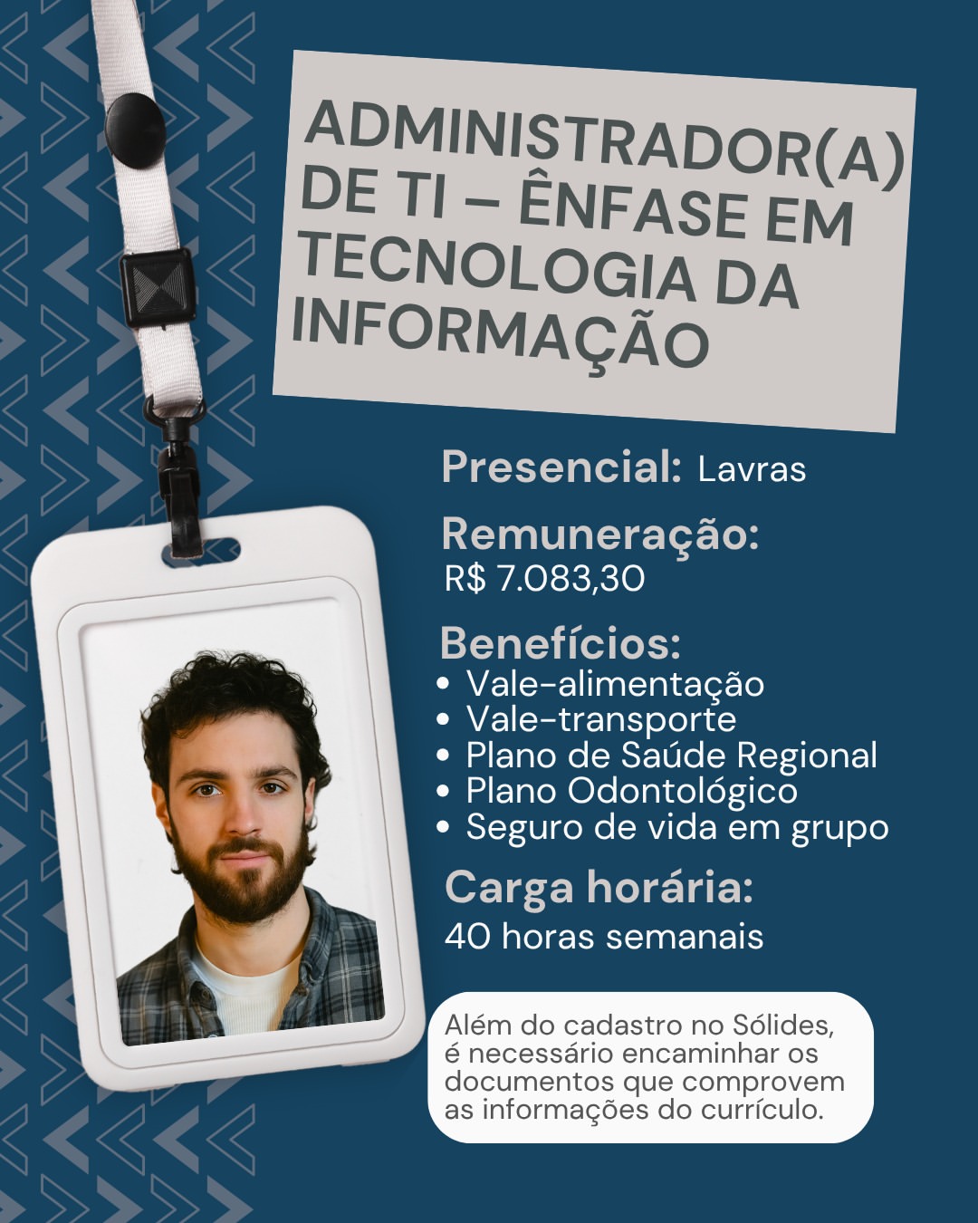 Administrador(a) de TI – ênfase em Tecnologia da Informação (Edital nº 30/2025): voltado à gestão dos ativos tecnológicos do Parque, implantação de soluções em nuvem e inteligência artificial e coordenação de contratos de suporte técnico. Requer graduação em Ciência da Computação, Engenharia ou áreas afins, pós-graduação concluída e experiência em gestão de TI, cloud e IA. Mais informações aqui.
