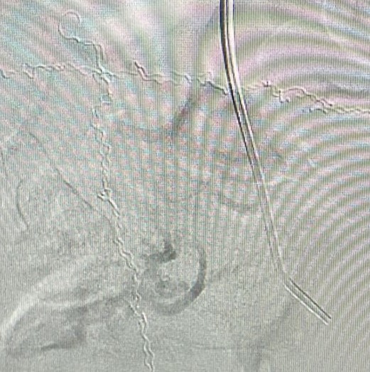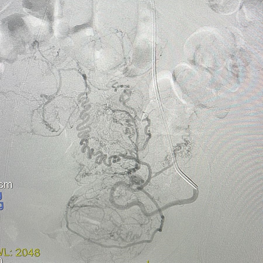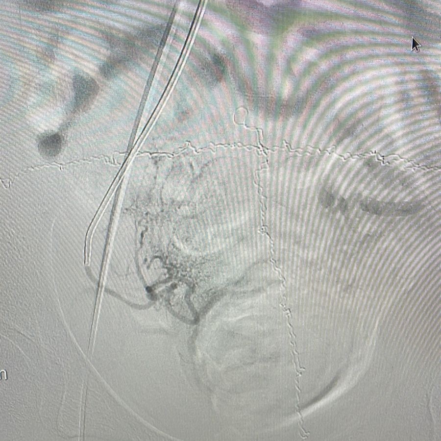 A embolização foi realizada em uma paciente de 46 anos que buscou tratamento devido a sintomas de dores abdominais do tipo cólicas intensas, frequentes e com sangramentos aumentados, além de dores e sensação de pressão na bexiga.