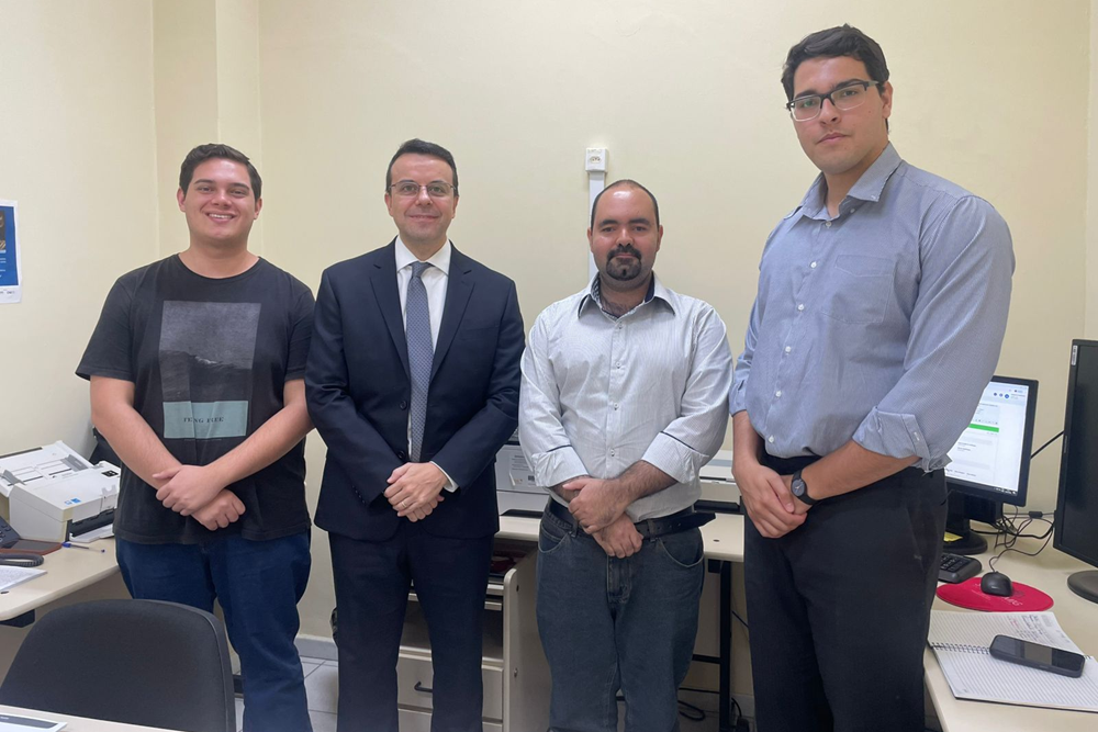 Da esq. para a dir.: o colaborador do Cejusc da Comarca de Itumirim, Diogo Canestri de Sá; o juiz coordenador do Centro Judiciário, Rodrigo Melo Oliveira; e os colaboradores da Cotac Elcio Maia e Pedro Reis (Crédito: TJMG / Divulgação)