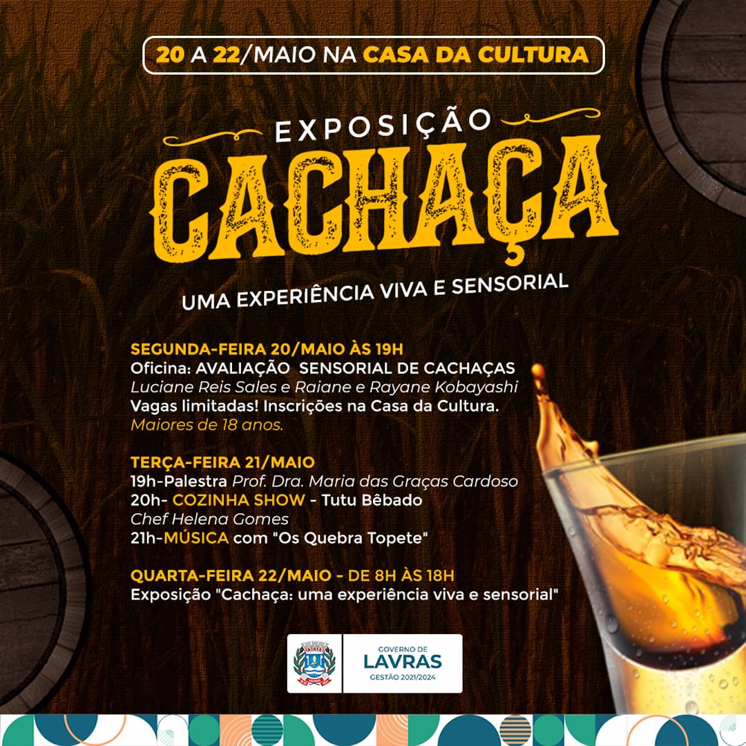 Para mergulhar em seus diversos aspectos históricos, culturais, sociais, econômicos e sensorial, haverá a Exposição “Cachaça: uma experiência viva e sensorial”, que acontecer de 20 a 22 de maio na Casa da Cultura em horário comercial.