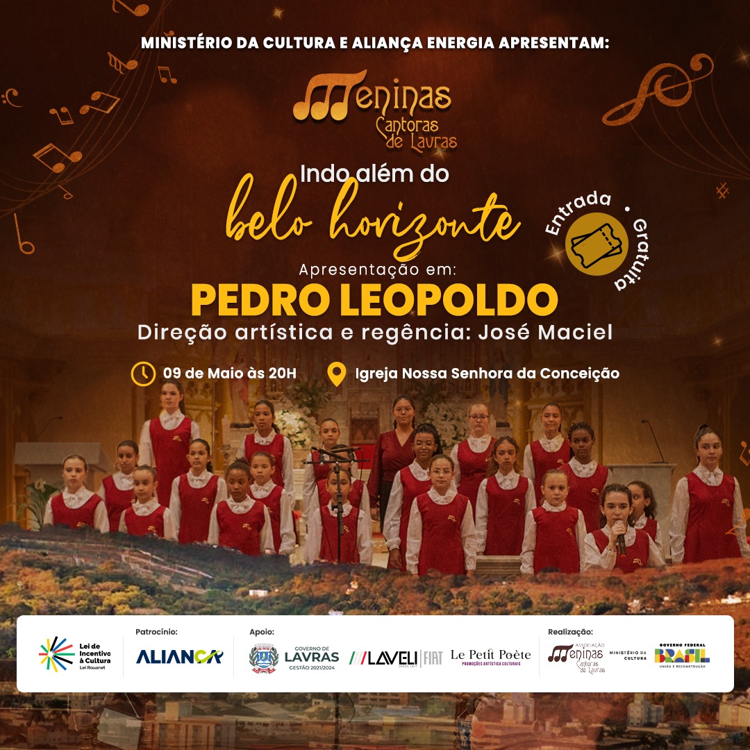 O Coral das Meninas Cantoras de Lavras tem o prazer de anunciar sua primeira apresentação na cidade de Pedro Leopoldo. O evento ocorrerá na Igreja Nossa Senhora da Conceição, no dia 9 de maio, às 20 horas.