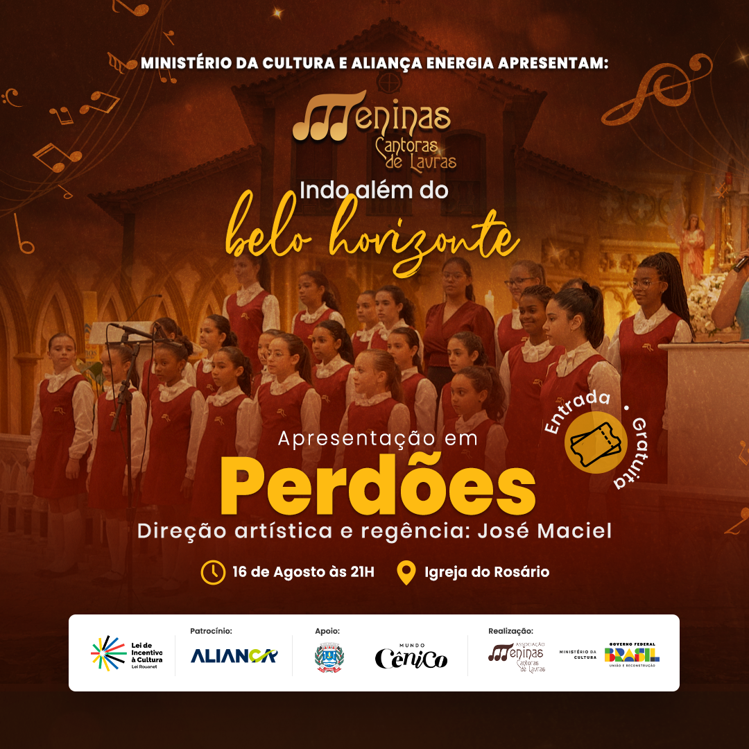 O coral Meninas Cantoras de Lavras tem o prazer de anunciar mais uma emocionante apresentação do projeto “Indo além do belo horizonte”. Desta vez, a cidade de Perdões será palco desse espetáculo musical imperdível. O coral, sob direção artística e regência de José Maciel, se apresentará no dia 16 de agosto, às 21h, na Igreja do Rosário. Será uma experiência única e memorável para todos os presentes.