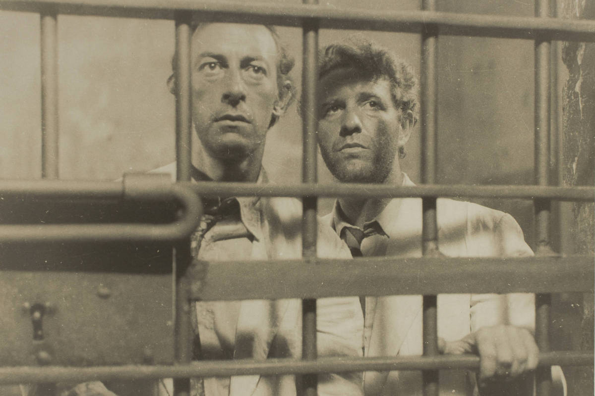 A imagem em preto e branco mostra dois homens olhando através das barras de uma cela. Eles parecem preocupados e estão vestidos com roupas formais, um deles com um paletó claro e gravata. O ambiente ao fundo é escuro e parece ser uma prisão.