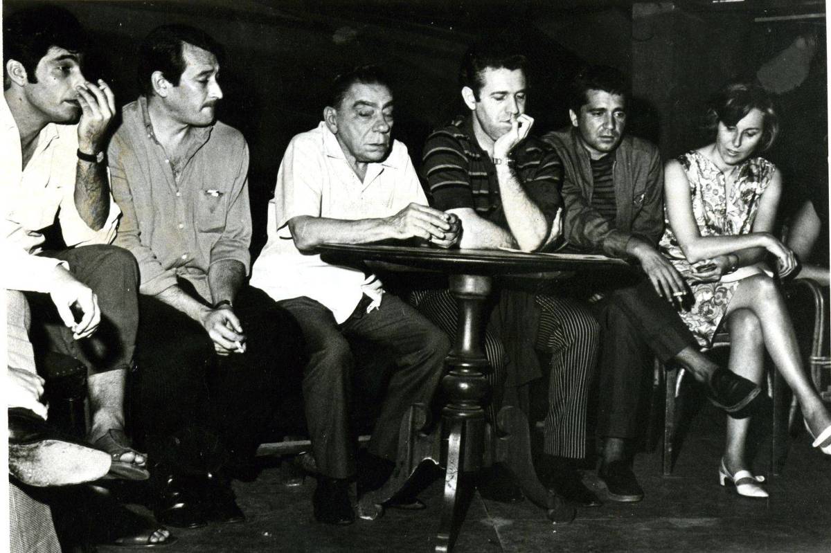 Da esq. para dir., atores Altair Lima, Paulo Goulart, Procópio Ferreira, Juca de Oliveira, Plínio Marcos e Nídia Lycia, em fevereiro de 1968, numa reunião sobre a greve da classe teatral contra as determinações da Censura Federal, no Teatro Galpão, em São Paulo – Folhapress
