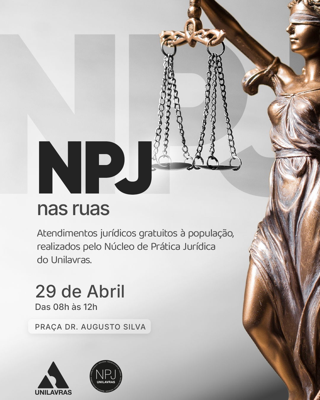No dia 29 de abril, das 8h às 12h, o Núcleo de Prática Jurídica (NPJ) do Unilavras estará presente na Praça Dr. Augusto Silva, em Lavras, oferecendo orientação e atendimento jurídico gratuito à comunidade.
