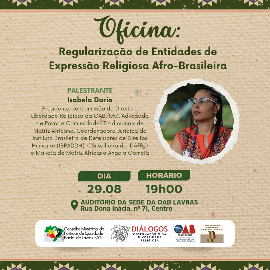 O Curta Lavras conversou com a advogada Isabela Cristine Dario, presidente da Comissão de Direito e Liberdade Religiosa da OAB-MG. Ela será a responsável por ministrar, nesta sexta-feira (29), às 19h, no auditório da OAB Lavras (endereço), a oficina “Regularização de Entidades de Expressão Religiosa Afro-Brasileira”.