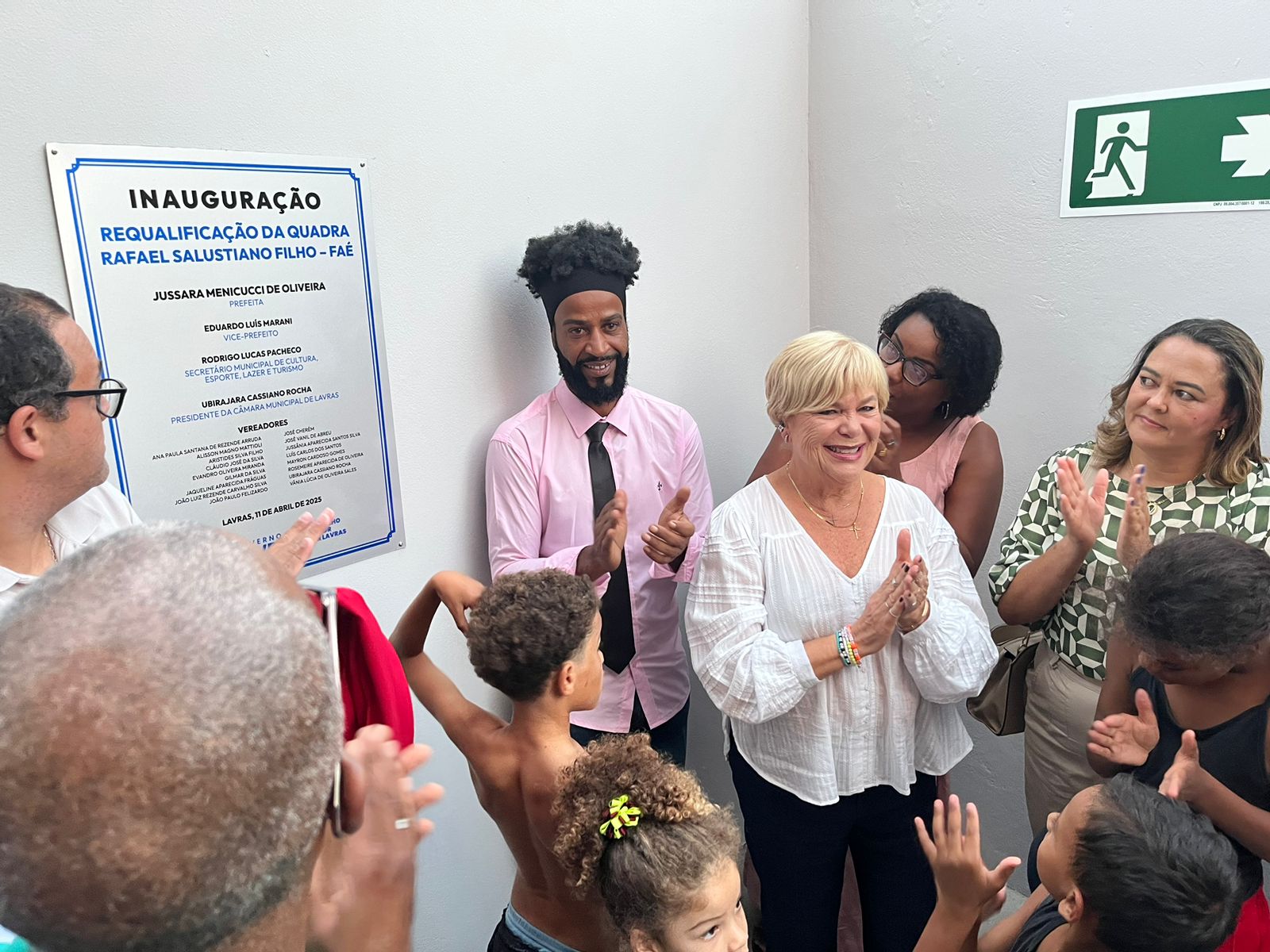 A prefeita Jussara Menicucci participou da cerimônia de inauguração da requalificação da quadra poliesportiva Rafael Salustiano Filho (Fae).
