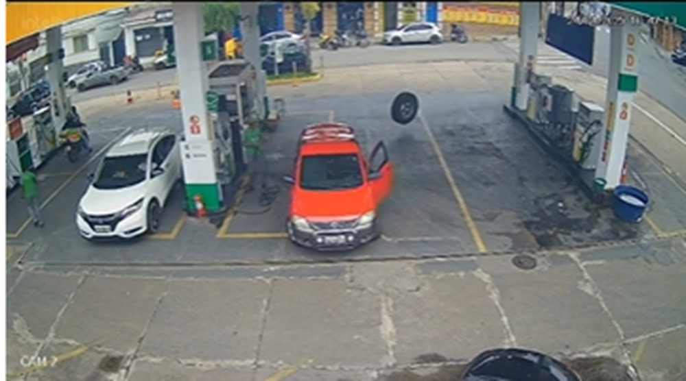 A cena que repercutiu nas redes sociais foi registrada por uma câmera de segurança do estabelecimento nesta quinta-feira (24). Na imagens, a roda atravessa a via, adentra o posto[ e atinge um veículo parado no posto. Ninguém ficou ferido.