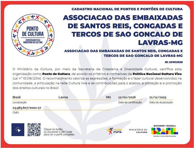 A Associação das Embaixadas de Santos Reis, Congadas e Terços de São Gonçalo de Lavras-MG agora é oficialmente um Ponto de Cultura certificado pelo Ministério da Cultura.