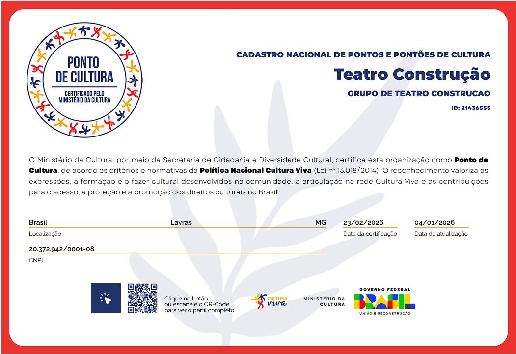 O Teatro Construção foi certificado como Ponto de Cultura pelo Ministério da Cultura, fortalecendo ainda mais sua trajetória de dedicação ao teatro e à formação cultural no município.