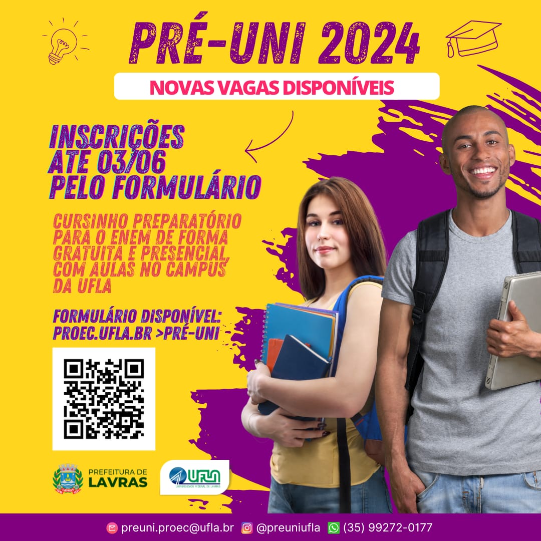 Estão abertas até segunda-feira (3/6), as inscrições para o Programa de Apoio Pré-Universitário (Pré-Uni), o cursinho pré-vestibular gratuito oferecido pela Universidade Federal de Lavras ( UFLA) em parceria com a Prefeitura Municipal de Lavras.