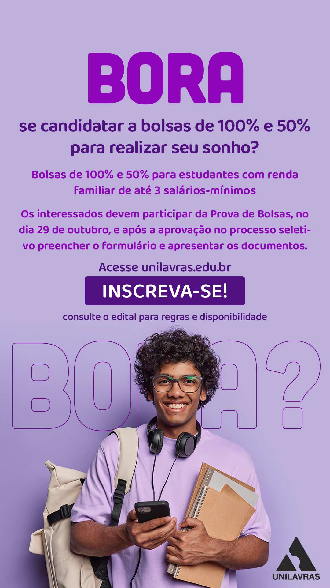 Garanta a sua inscrição pelo link https://unilavras.edu.br/promocoes/prova-bolsas/ até 27 de outubro. A prova também será realizada no Unilavras no dia 29 de outubro, às 14h.