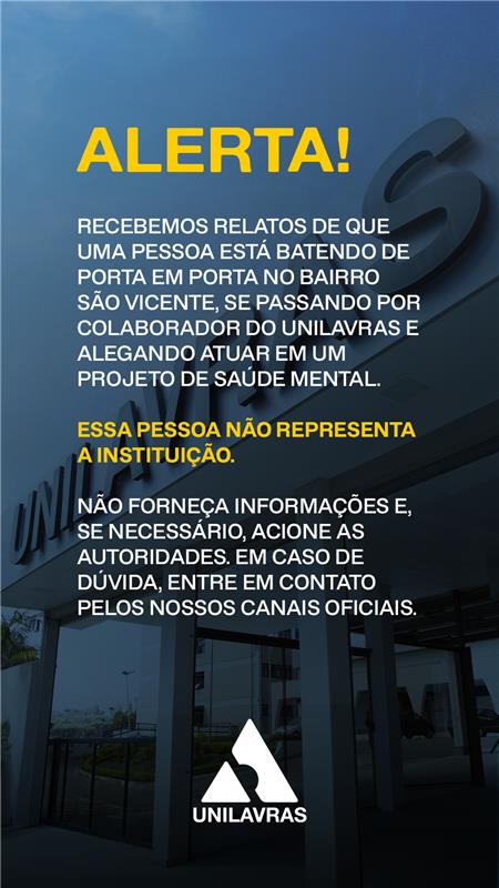 O Unilavras tomou conhecimento de que uma pessoa tem batido de porta em porta no bairro São Vicente, se passando por colaborador da instituição e afirmando atuar em um projeto de saúde mental para aplicar uma pesquisa.