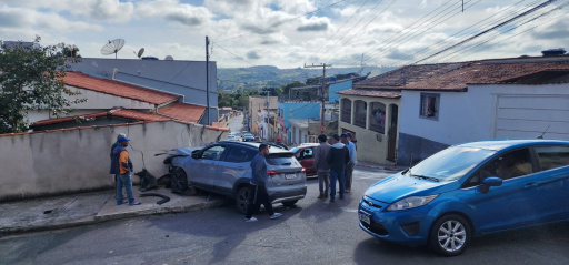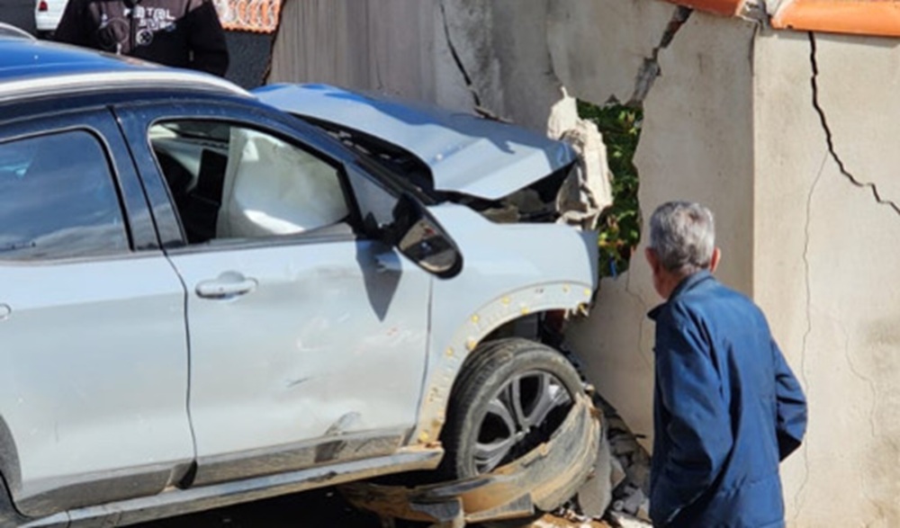 O impacto da batida dos veículos danificou o muro da residência atingida. A Polícia Militar esteve no local para apurar as causas do acidente.